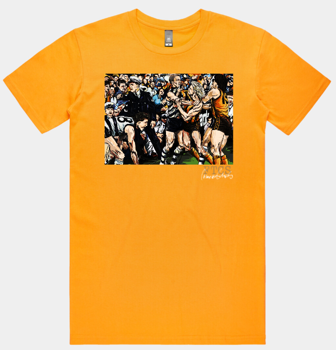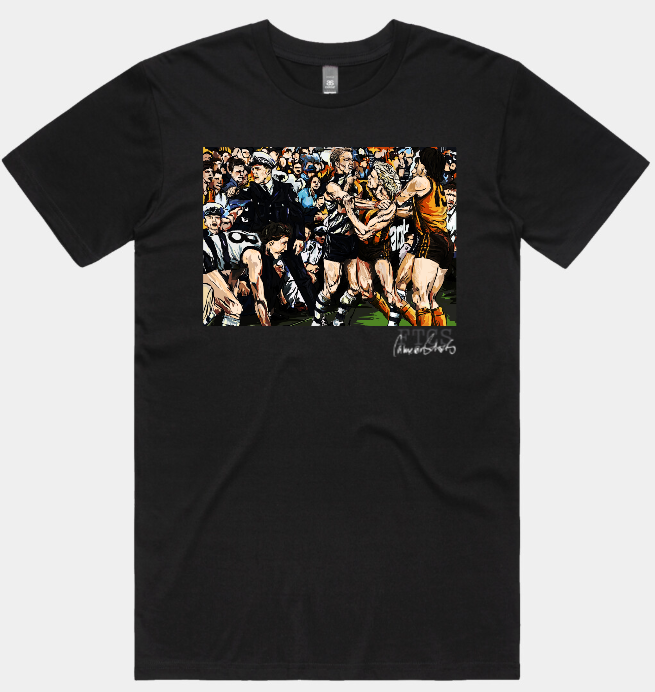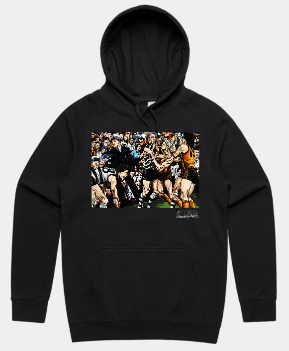 Step back into footy history with our exclusive T-shirt and hoodie, showcasing Cameron Schwab's artwork capturing the legendary clash between Derm, and Steven Hocking in the 1989 GF. We love this art from Schwabby.