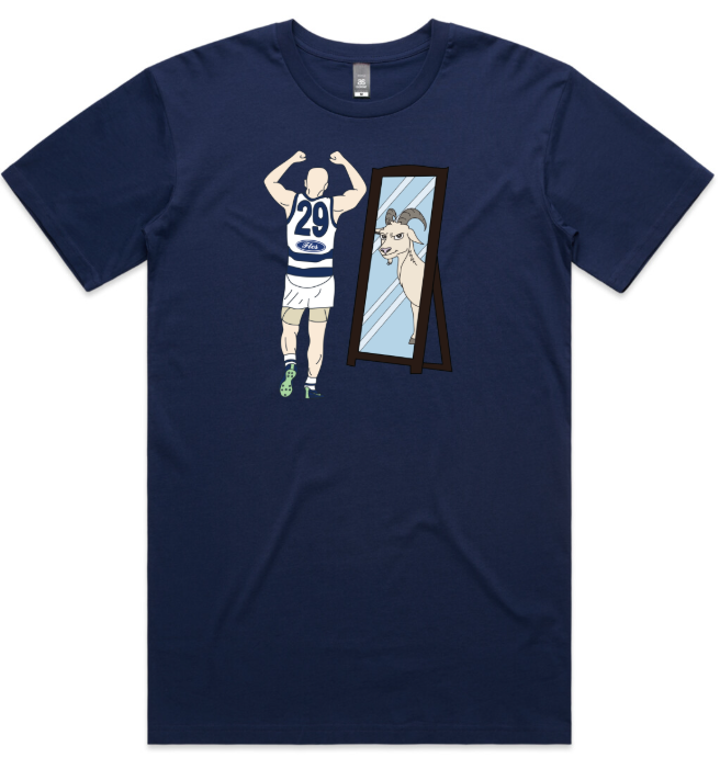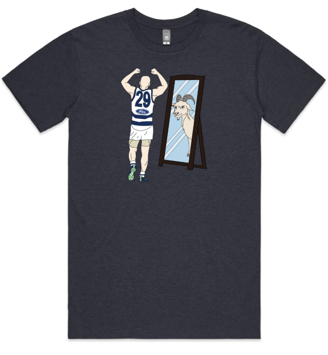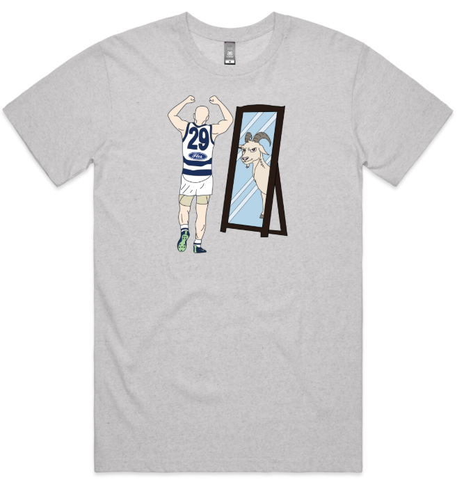 This pays tribute to Gary Ablett Jr with a bold design—Gary standing tall in front of a mirror, only to see a goat staring back. A quiet reflection of greatness, class, and a career that did all the talking.