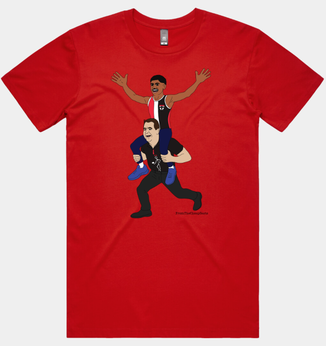 Celebrate one of the Saints' greatest moments! And we're not talking about Nas' clutch marks and goals we're talking about the behind the scenes celebration with Nas on Ross' shoulders. Now immortalised on this exclusive tee and hoodie.